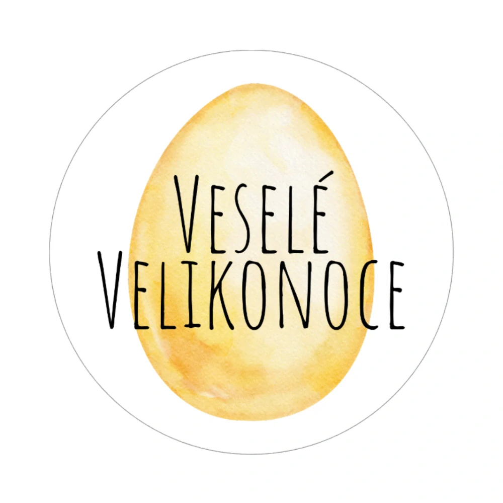 Samolepky - Veselé Velikonoce - vajíčko žluté, kruh 4cm (arch 20ks)Skladem30 Kč/ ks